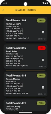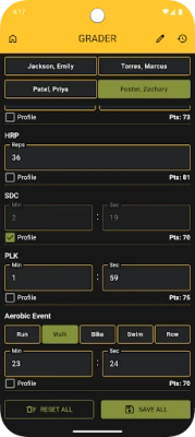 Grader Mode: Seamlessly grade multiple Soldiers at once. Switch between up to four individuals, input their scores in real time, and save all results when finished. Perfect for NCOs, graders, and PT test administrators.