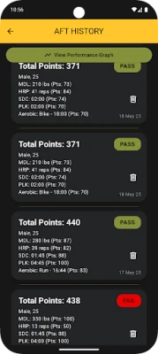 Score & Performance Charts: Visualize performance history with dynamic score charts that show total scores, event details, pass/fail outcomes, and body composition changes by date. Instantly spot strengths, weaknesses, and long-term progress.