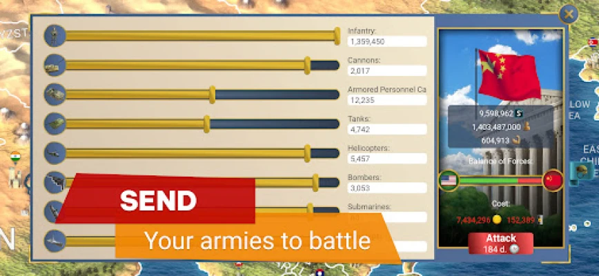 Build army and navy, train soldiers, gain experience in battles, send saboteurs and spies, research new war technologies. Build barracks, arsenals, airfields, hangars, shipyards, and warehouses. Study and build nuclear weapons, launch a nuclear strike on the enemy!