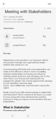 Simply Stakeholders mobile app allows you to access and manage your stakeholders on the move.