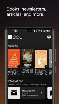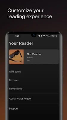 The Sol mobile app allows you to seamlessly manage your Sol Reader. Deliver new books, articles, and newsletters to your Reader. Archive old ones. Access settings, accounts, and tech support in one place.